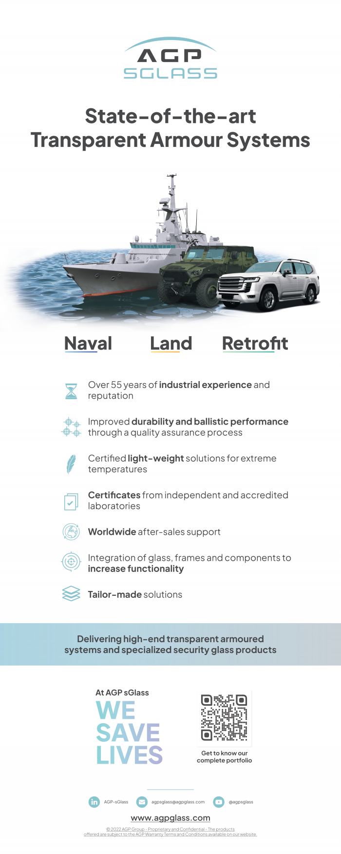 AGP is a manufacturer of high-end transparent armoured systems and specialized security glass products. With an industrial expertise since 1965, AGP serves customized solutions for military, naval, law enforcement, government, corporate and private customers and worldwide after-sales support.