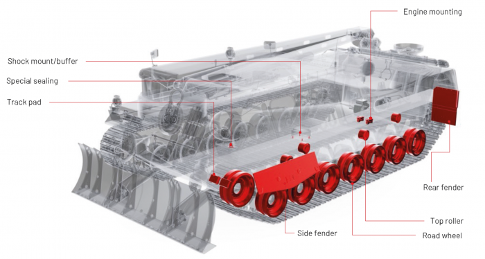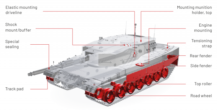 The GMT Group is specialized in developing & manufacturing of rubber-to-metal-bonded elements and molded rubber parts. Our product range for defense technology comprises aggregate bearings, shock mounts, cabin mountings, track pads, protection systems, wheels and support rollers. We provide R&D to find solutions in close co-op with our customers.