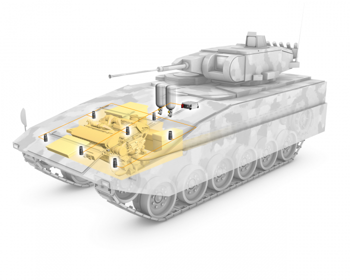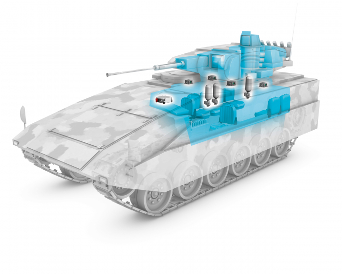 Fire suppression system: crew compartment protection in case of explosive fires in < 150 ms