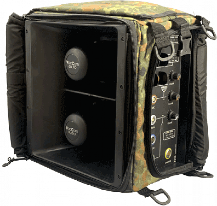 Das VocCom-Audio LSA-X-MK2 ist ein patentiertes Hochleistungslautsprechersystem in ultrakompakter ArrayBauform , 6,9 kg Eigengewicht, Flexible BB-2590 Wechsel-Akku-Stromversorgung, Einsatz in jedem Terrain, Exzellente Sprachübertragung auf Entfernungen von 500 bis 900 m.
